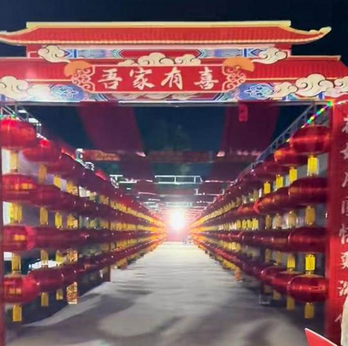 燈籠街的門頭上面寫著愛女和賢婿,據當地網友稱新郎和新娘是同一個村的,兩家離得特別近,村裡的這些布景是兩家一起辦的。