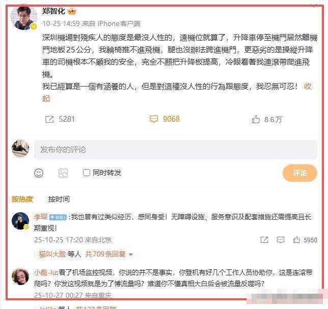 在鄭智化的發文中,深圳機場讓他的登機體驗非常不好: