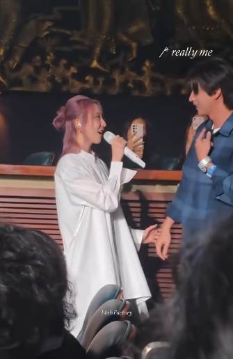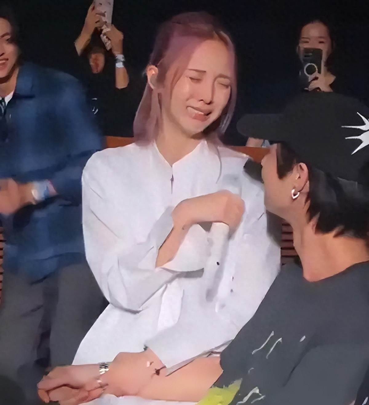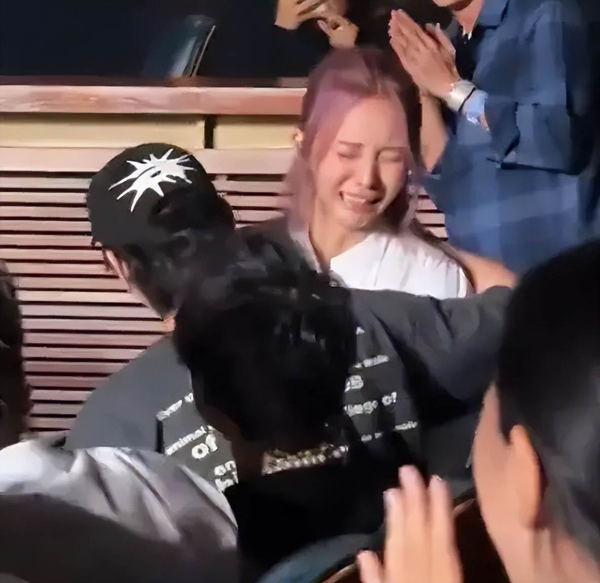 她當場將Gulf從座位「移開」,自己則坐上扶手對Bright深情獻唱情歌,接著情緒激動,邊唱邊哭,最后還與Bright擁抱,對方則一邊輕拍她的背安撫,全場瞬間爆出尖叫聲。