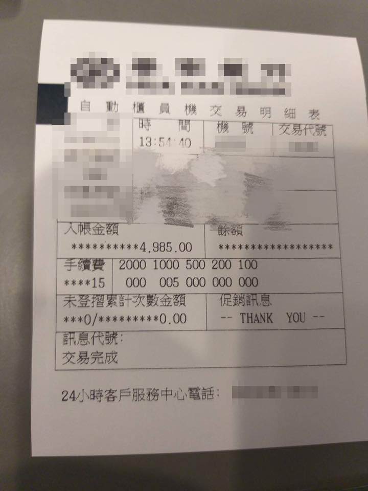 一位網友上臉書社團《爆廢公社》抱怨廉價的友誼。朋友急用時,原PO二話不說就拿出5,000元幫忙,後續朋友透過ATM還錢,原PO竟然只收到4,985元,他傻眼曬出明細:「連手續費都算我的!」