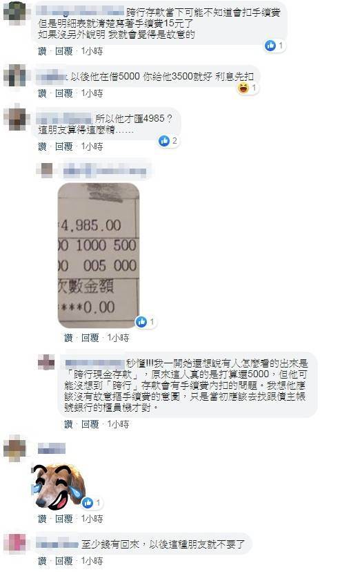 網友緩頰:「我想他應該沒有故意摳手續費的意圖,只是當初應該去找跟債主賬號相同銀行的櫃員機才對」、「無心之過吧,他放5張1千元進ATM匯給你,當然扣在現金,ATM總不可能存5,015元吧,可能是急著還錢,我認為這朋友可以交」。