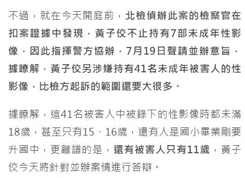 41名被害人中被錄下的性影像時都未滿18歲,最小的只有11歲,有的女孩是剛剛小學畢業升到國中,對于檢方的指控,黃子佼在8月12日下午現身答辯。