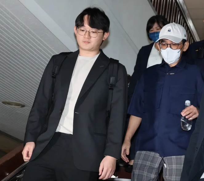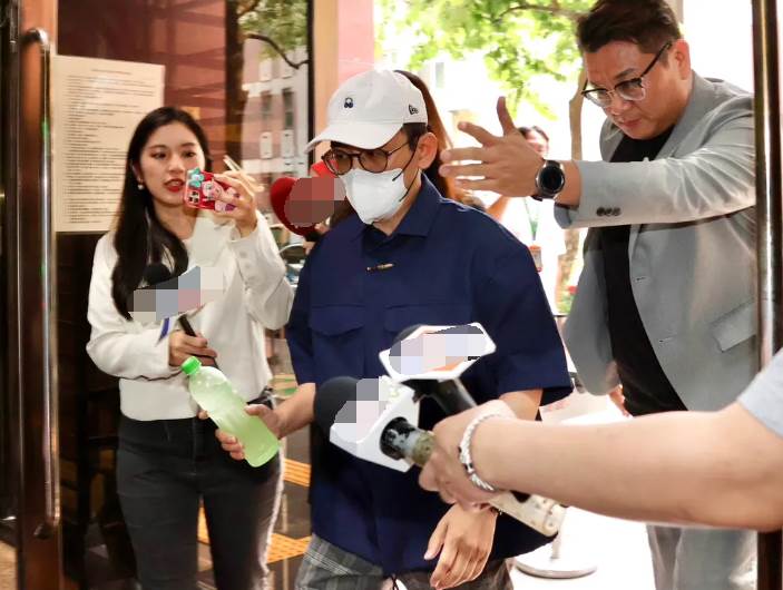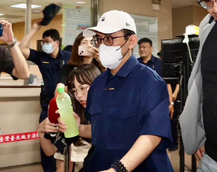 黃子佼直到開庭前十分鐘才現身,還是穿著那件深藍色的短衫,戴著白色帽子和口罩,手中戴著佛珠,沒有回答記者的問題,匆匆步入法院。