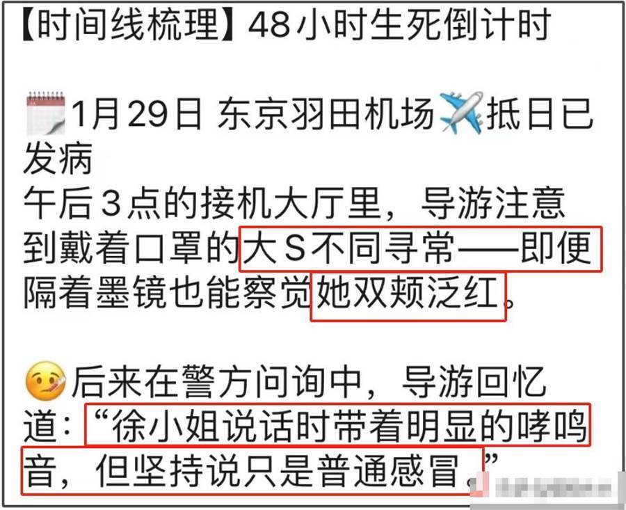 有網友曝出大S到日本生病、就醫直到去世的時間線,導游29日接到S一家的時候,大S的狀況就不是很好,有咳嗽且有明顯哮鳴音,但這一行人似乎沒當回事,依舊按照旅行計劃去泡溫泉。
