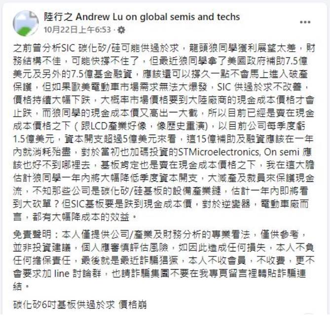 知名分析師陸行在接受媒體采訪時坦言,Wolfspeed目前財務結構十分不穩固,若不大刀闊斧地調整,很可能會面臨更為嚴峻的考驗。為了減少季度資本支出,陸行預測,Wolfspeed未來或將不得不采取「減產」甚至「大規模裁員」的手段,保住公司的現金流。此消息一經傳出,便引發了Wolfspeed員工的恐慌情緒,公司內部已然彌漫著緊張不安的氛圍。對不少在Wolfspeed辛勤工作的工程師與員工來說,眼前的困境不僅關系到企業的生死存亡,更關乎他們個人的經濟前途與職業生涯。