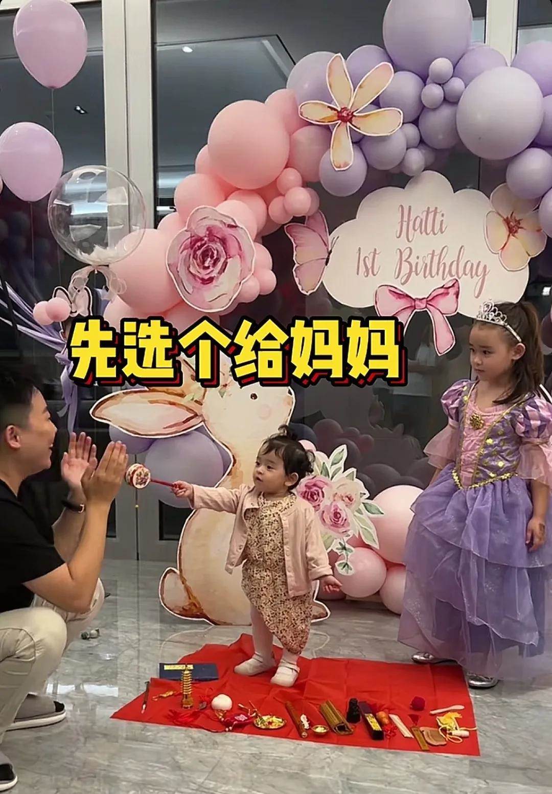 回想哈提一周歲生日的時候,家里布置的很有氛圍,姐倆都穿上小裙子,并且哈提是走著去抓周的,那時的小哈提已經走的很穩了。