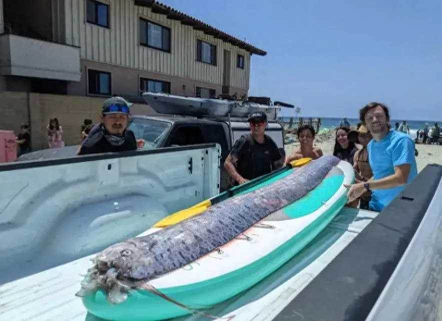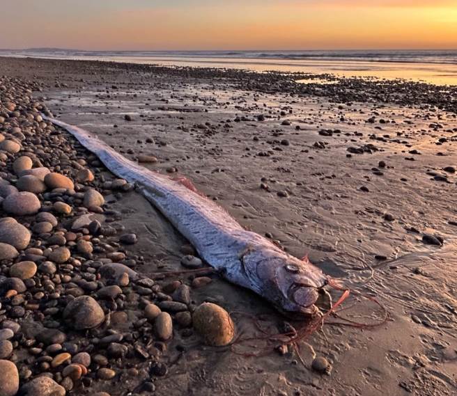 根據媒體《New York Post》的報導,11月初,一條長達3公尺的皇帶魚被人發現擱淺在美國加州恩西尼塔斯 (Encinitas) 的格蘭德維尤海灘,這條地震魚頭上有著2根長長的觸鬚,詭異外型在網上掀起討論。