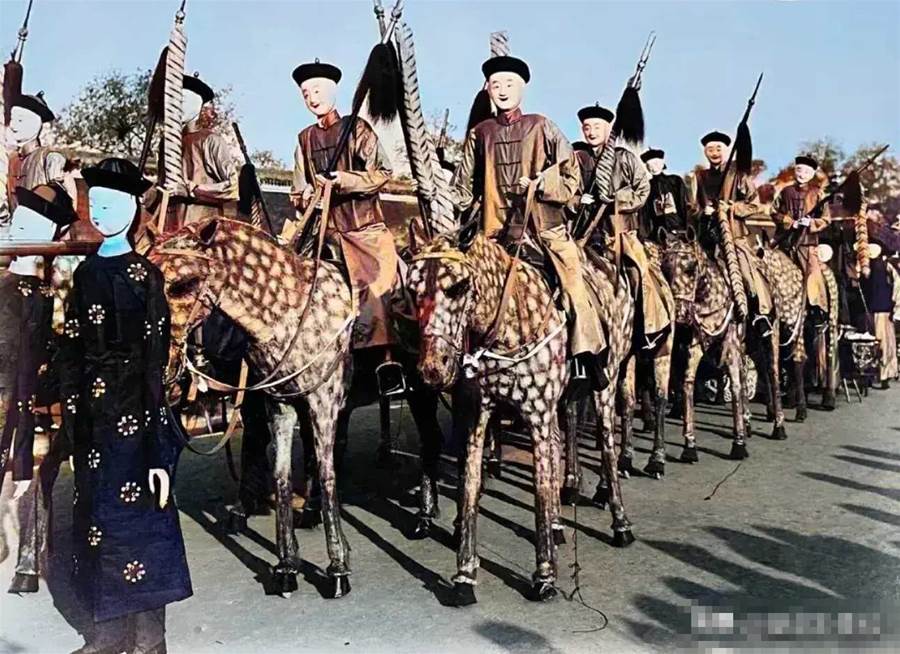 一隊新式軍裝騎兵,手持長矛,裝束齊整,正莊嚴地走在最前端,為已故太后開道。