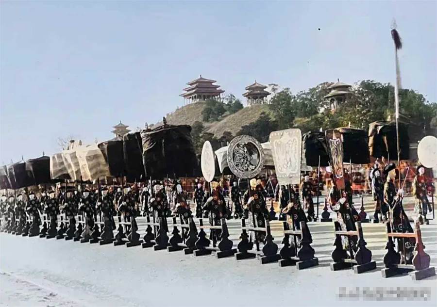綿延無盡的仆役行列,身穿猩紅色綢緞衣服,帽上插著黃色羽毛,他們肩扛慈禧的靈柩,步伐整齊劃一。隨著隊伍的推進,一眼望不到盡頭的紙人紙馬開始出現,這些惟妙惟肖的紙制品仿佛給整個葬禮增添了一層神秘色彩。