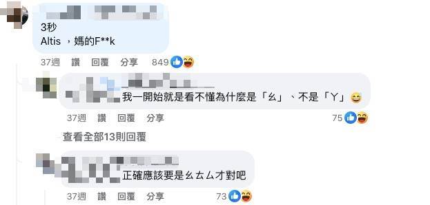 事實上,只要再多看幾眼、多念幾次,就會恍然大悟啦!觀看部分留言,已經有人猜出答案了!右上方的「ㄇㄉㄈㄎ」是英文的髒話用語「Mother Fxxker」的注音拼音版本,左下方的「ㄠㄒㄙ」則是「TOYOTA」推出的「Altis」系列車款。