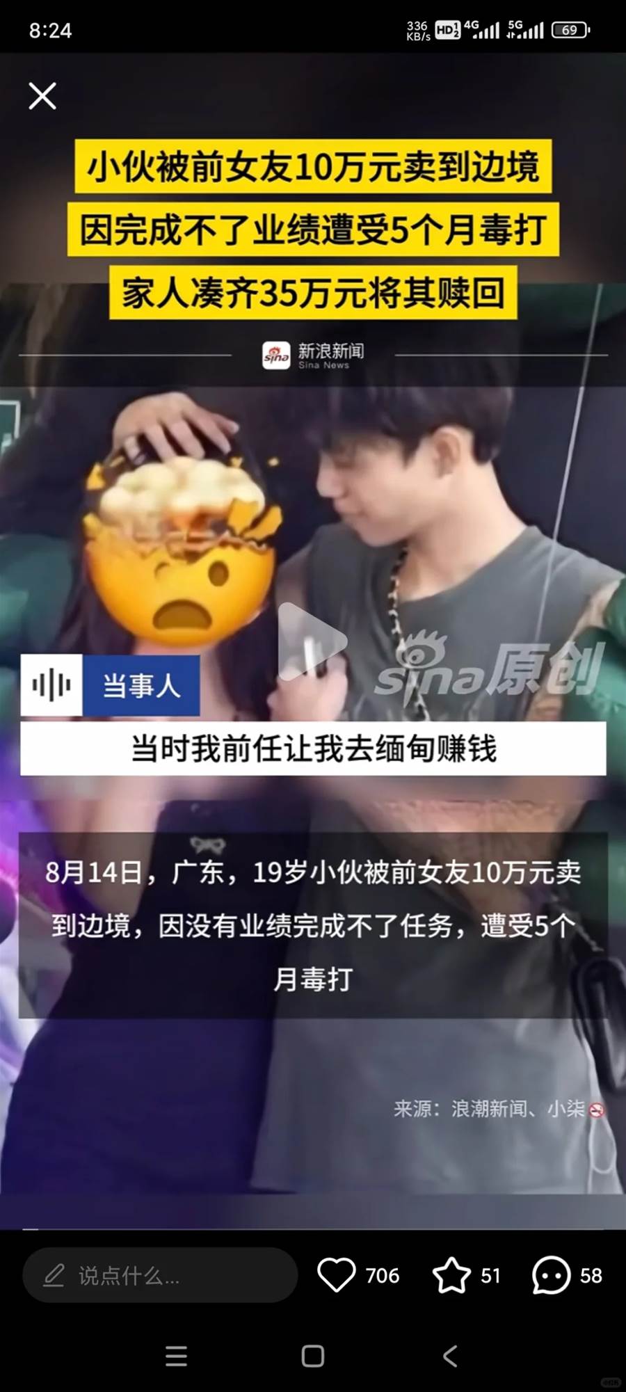 中國廣東湛江一名19歲少年小黃(化名),因戀愛腦上頭,在今年2月慘遭17歲同居女友小周(化名)以人民幣10萬元(約新台幣42萬)賣給緬甸凱旋電信詐騙園區。抵達當地後,他被剃光頭髮、關進黑屋,每日被迫從事電信詐騙,若業績未達標便遭毒打,甚至被打到耳朵失聰。